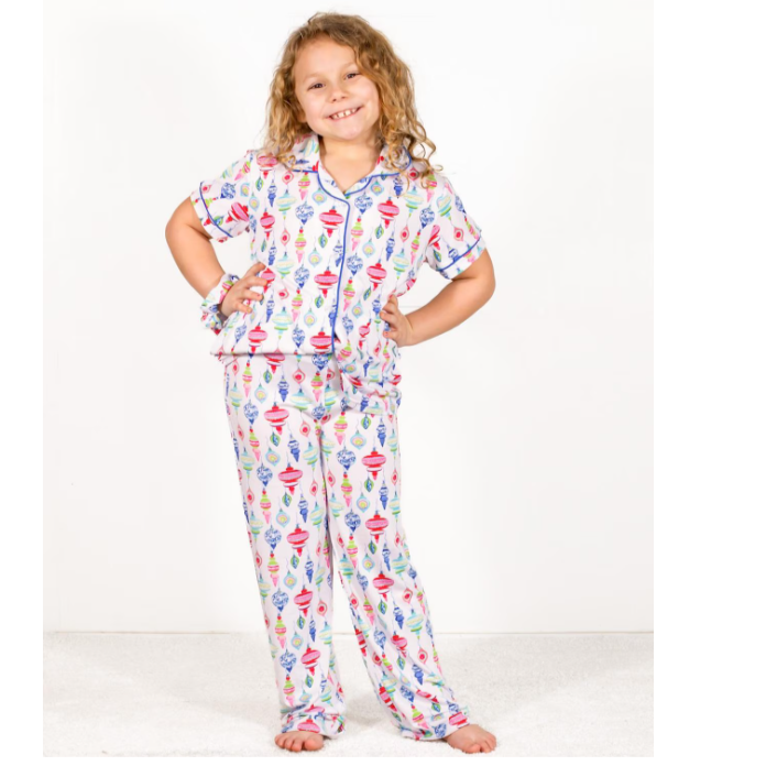 Be festive in our whimsical wonders pajama set! These super soft pj's feature whimsical ornaments with contrasting blue trim! Button up short sleeve top and long pants.